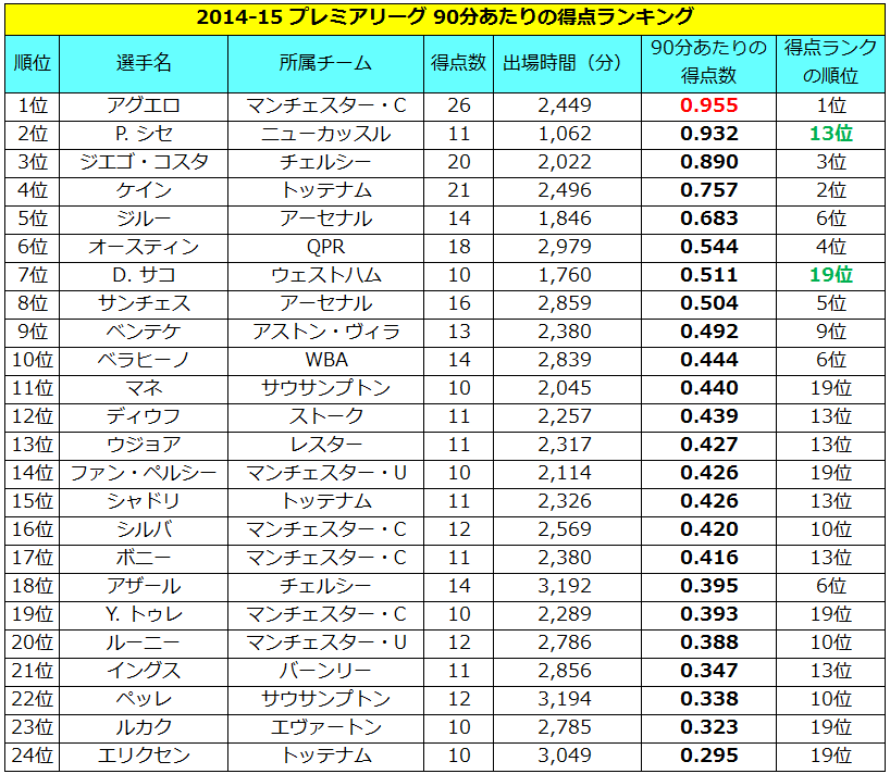 2014-15シーズンのプレミアリーグ、90分あたりの得点ランキングはこの通り!