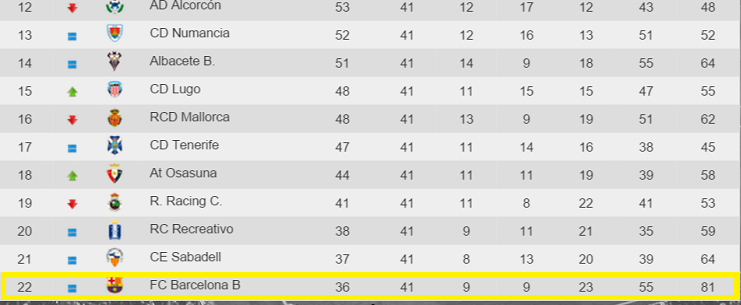 以前からリーガ・アデランテで苦しんでいたバルセロナB。一時は最下位を脱していたものの、第40節でラス・パルマスに敗れると再び最下位に。