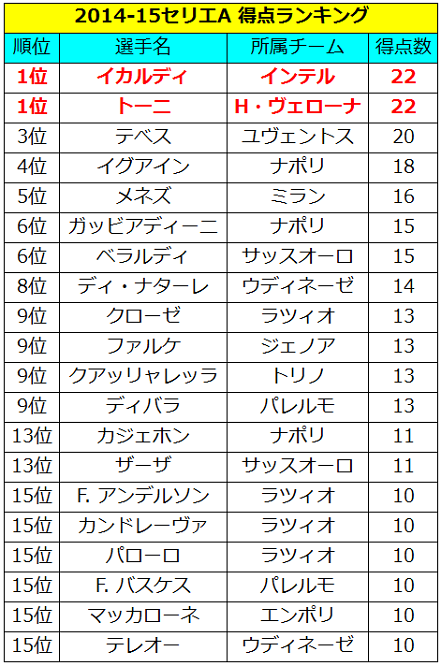 なお、各国リーグとも2桁得点をあげた選手を全員並べている。