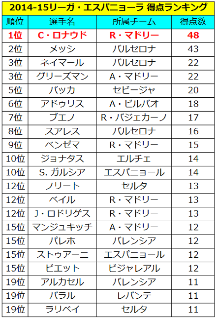 また、欧州で最も得点をあげた選手に送られる「ヨーロッパ・ゴールデンシュー」賞だが、現在のところクリスティアーノ・ロナウドの受賞が有力視されている(48得点×2.0倍=96.0ポイント)。
