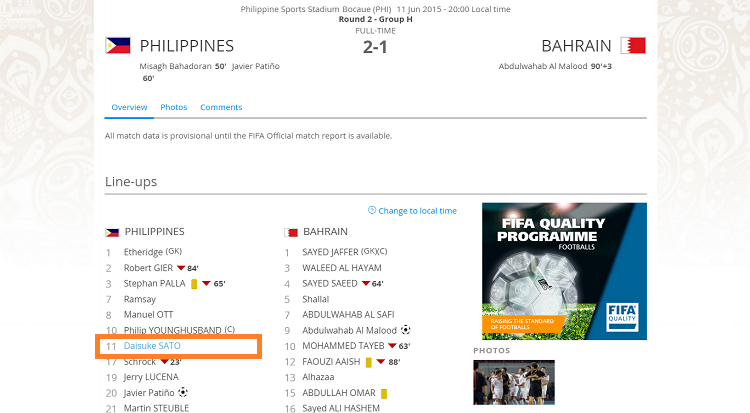 試合は2-1でフィリピンが勝利しており、日本代表より少し早くにW杯予選の白星をあげていたようだ