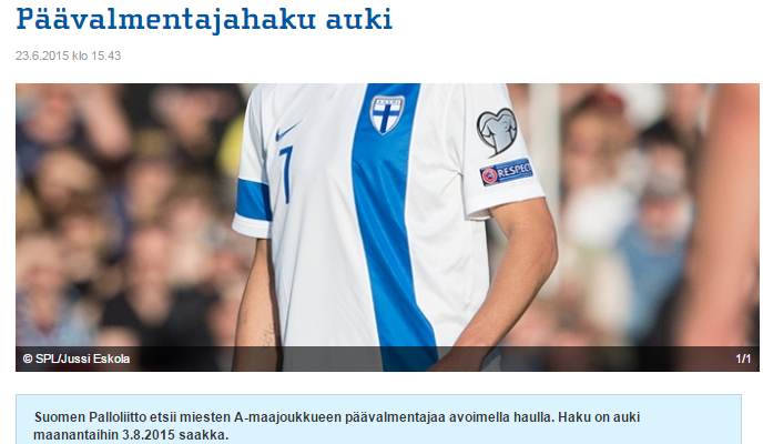 ザッとまとめると、「フィンランドサッカー協会は男子A代表チームのヘッドコーチ(監督)を探しています。白と青のカラーが成功することを見るために同じ情熱を共有できる(人物)」とのこと。