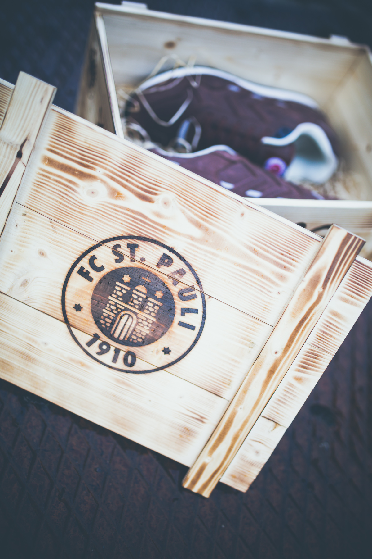 また、スニーカーはロゴが焼印された特注の木製ボックスに入れられている。