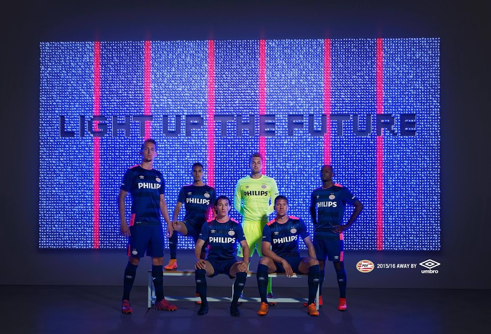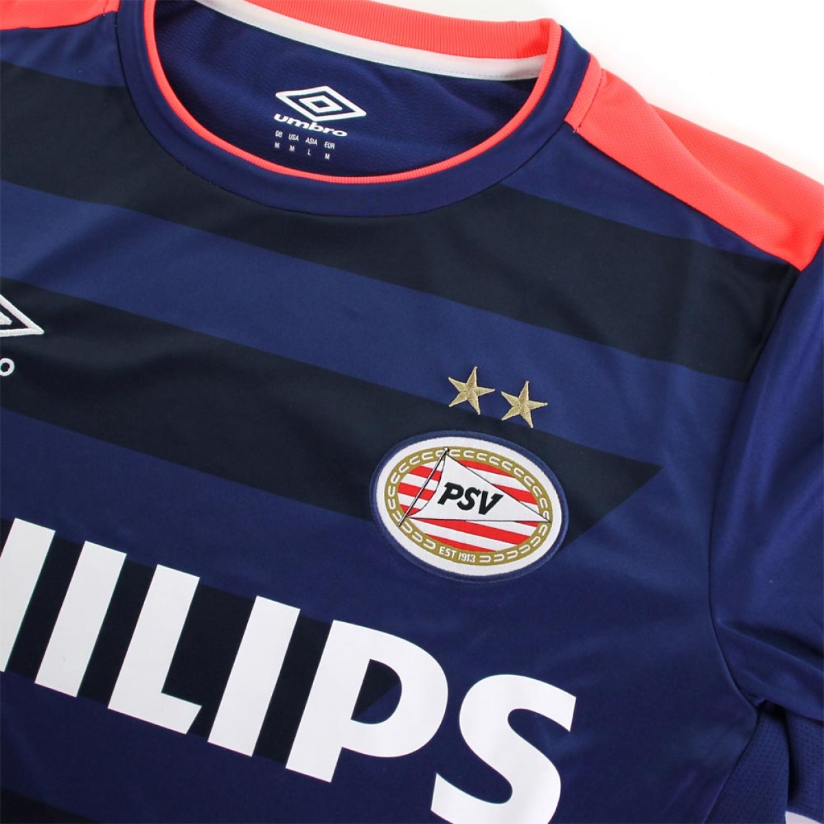 アウェイは一転モダン寄りのデザインで、濃い青を基調にシャドーのボーダー柄を採用。さらに斜めの切り替えしで変化を付けている。