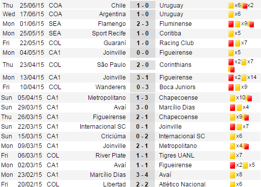 — TyC Sports (@TyCSports) 2015, 6月 29普段は地元ブラジルの1部リーグや州選手権、コパ・リベルタドーレスで試合を裁いているというヒッシ氏。『soccerway』を参考に、最近裁いた19試合を調べてみた。