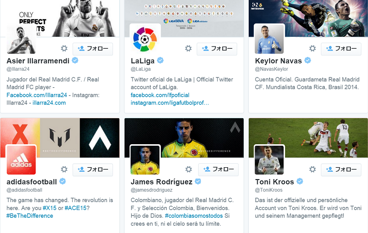 マドリーが在籍するリーガ・エスパニョーラやマドリーのユニフォームサプライヤーであるadidasといったアカウントがフォローされているのだが、選手で言えばアシエル・イジャラメンディやケイロル・ナバス、ハメス・ロドリゲスといった現所属メンバーのみになっている。