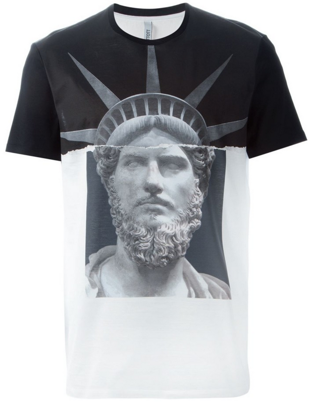 自由の女神像の顔がパッチワークされたようなTシャツは『Neil Barrett(ニール・バレット)』のもの。