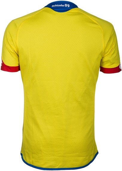 普通のクルーネックである点は異なるが、首まわりに青、袖口に赤を配したデザインは同じLottoのマインツの新アウェイと重なる。