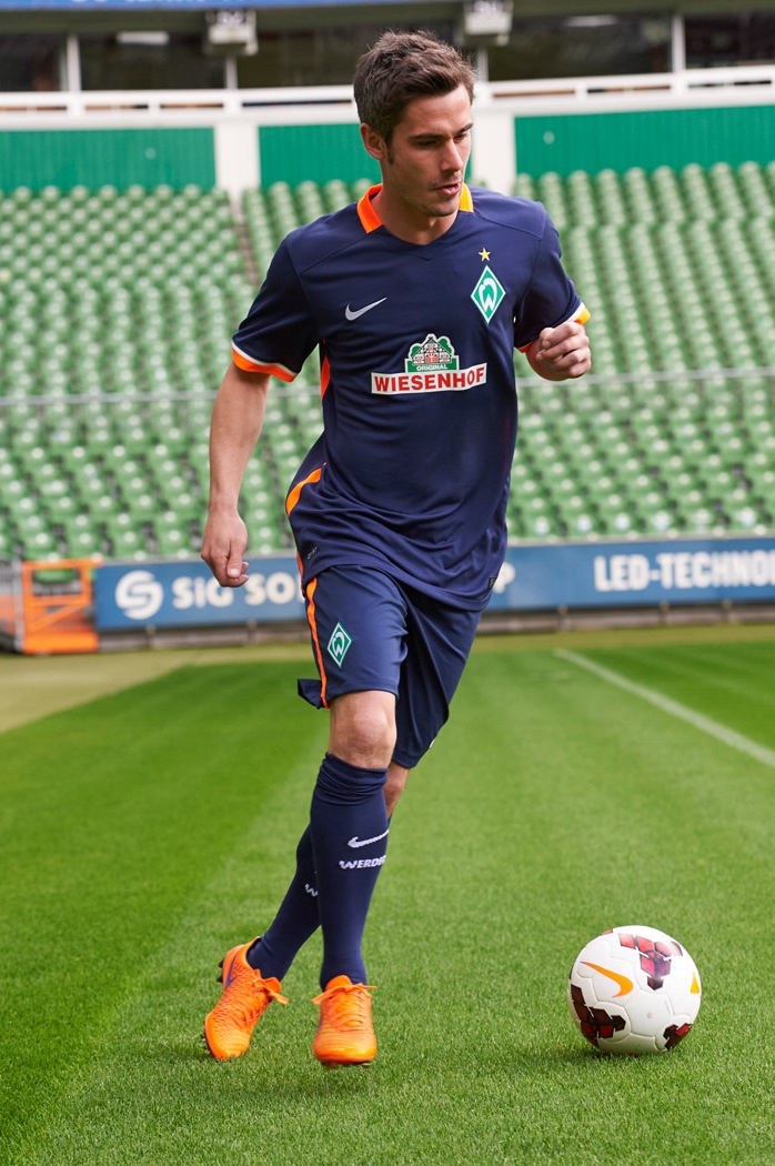 ブレーメンは昨季終盤に懐かしい感じの新しいホームユニフォームをお披露目。それに続くアウェイは紺を基調にオレンジをアクセントとして配したデザインとなっている。
