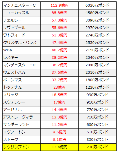 シティの赤字額が断トツで、現時点ですでに100億円を突破…。2番目は意外にもニューカッスル。ただ、彼らの場合は放出による収益が相当に少ないのが影響していそうだ。そして、ワトフォードとクリスタル・パレスの2チームは収益なし。そのなかで、サウサンプトンだけが13億円のプラスを出している。