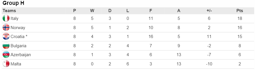 次節のブルガリア戦に敗れ、イタリアとノルウェーが勝利すれば3位が確定。