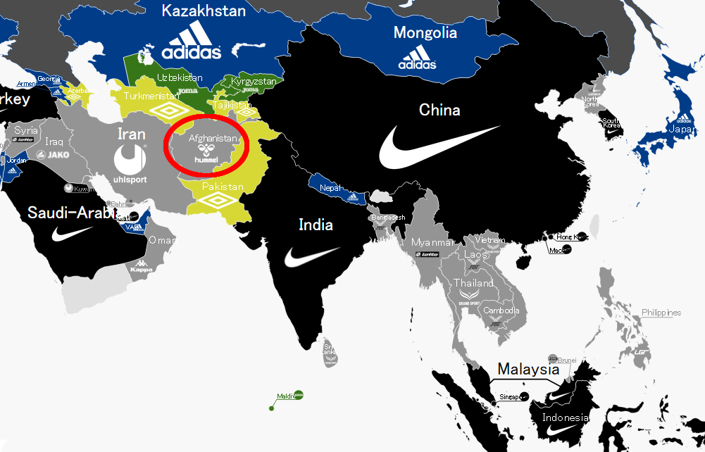 日本代表の今日の相手、アフガニスタン代表が着用しているのはHummel製のユニフォーム(赤)。