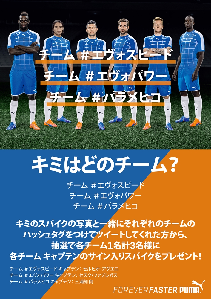プーマフットボールの公式Twitterアカウント(@pumafootball_jp)をフォローし、自身のTwitterアカウントで自分のスパイクの写真と一緒にそのチーム(※エヴォスピード、エヴォパワー、パラメヒコのいずれか)のハッシュタグをつけてツイートするだけで応募完了。最新モデルでなくても問題なく、またトレシューなどでもエントリー可能とのことで、かなり良心的である。