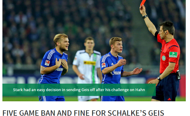 ドイツサッカー連盟は、シャルケのMFヨハネス・ガイスに対し、1.5万ユーロ(199万円)の罰金と5試合の出場停止を科すと発表した。