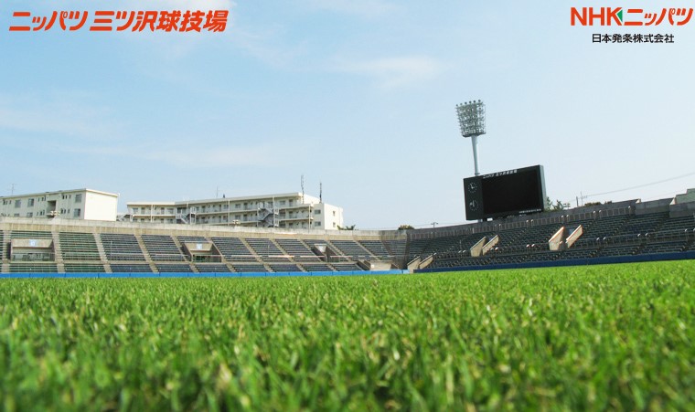 ≪ニッパツ三ツ沢球技場。スタジアム入口やホームゴール裏にも「NHKニッパツ」のロゴ(出典:同球技場公式サイト)≫
