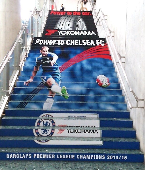 横浜ゴムでは以前のモーターショーから全ての階段をジャックして自社の広告に使っていたそうですが、今回はここにチェルシーの各選手を使いました。