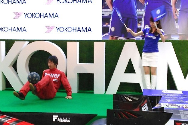 昨日見ていた大パネル前の青いカーテンが引かれると、中からは「CHELSEA FC」と「YOKOHAMA」のロゴが入ったタイヤが現れました。