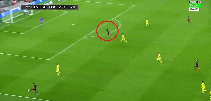 ネイマールが左サイドでボールを受けた時、オフサイドラインをやや超えたところで息を潜め、DFラインの戻りを静かに待つスアレス。