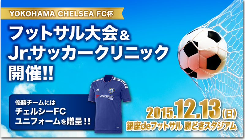 ≪横浜ゴムが「YOKOHAMA CHELSEA FC杯」として企画しているフットサル大会と小学生向けクリニックの告知ページの冒頭画像。12月13日に東京・勝どきで開催、12月1日まで受付(https://yokohama-chelseafc-futsal.jp/)≫