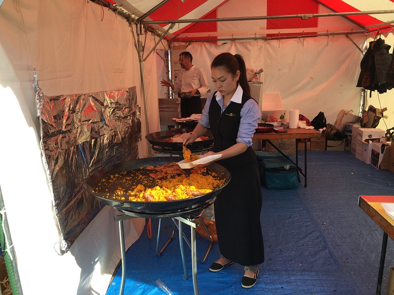 人、人、人…。お昼時になると飲食ブースはどれも大行列になった。30のうち約半分はパエリアの店であるにもかかわらずどこも行列だった。ワインを取り扱う店も多くお昼時から一杯やりながらおいしいスペイン料理に舌鼓を打つ。スペインの市場「メルカド」を彷彿とさせる作りになっている。