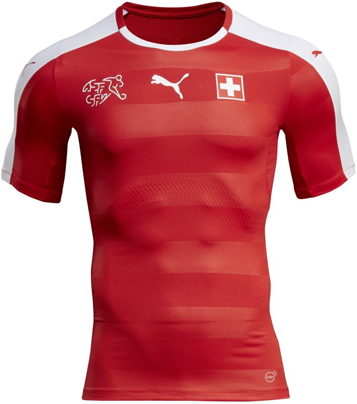 シャドーボーダーを採用したスイスの新しいホーム。左胸には2010年の南アフリカワールドカップに向けたモデルで追加された国旗が引き続き掲げられている。