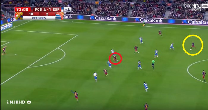 メッシのすぐ前にはエスパニョール選手がパスコースを限定しており、スアレスの近くにも2人の選手がついていた。パスコースはないかに思われたが、瞬時の判断と素早いキックによりボールはスアレスのもとへと繋がり、決定機となったのだった。