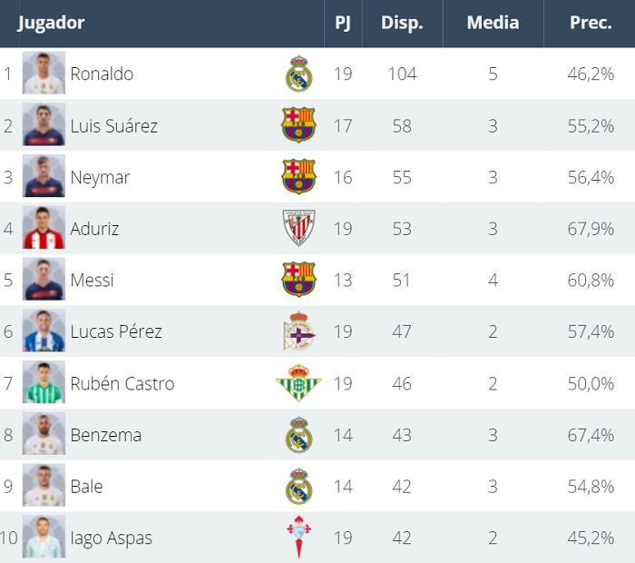 スアレスはロナウドより2試合出場が少ないが、それでも50本近く離れているなんて…。4位のアドゥリスはロナウドと同じ19試合でプレーしているが、それでもロナウドよりシュート数が51本も少ない。