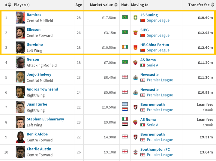 それぞれ、ラミレス(チェルシーから江蘇蘇寧)が1960万ポンド(およそ33億9900万円)、エウケソン(広州恒大から上海上港)が1295万ポンド(およそ22億4500万円)、ジェルビーニョ(ローマから河北華夏)が1260万ポンド(およそ21億8600万円)となっている。