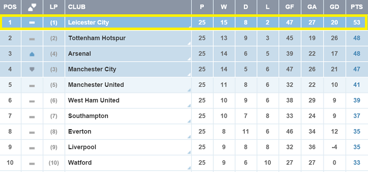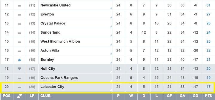 現在プレミアリーグで首位を走るレスターだが、昨年の2月8日時点ではなんと最下位に沈んでいたのだ。