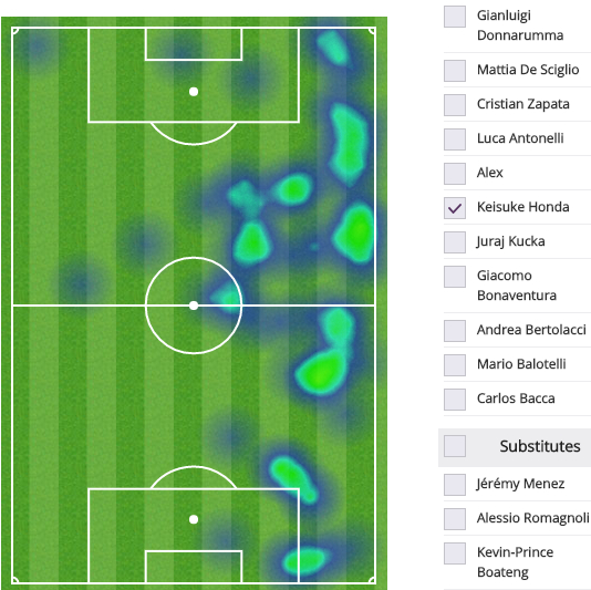 ちなみに、82分間プレーした本田のヒートマップはこんな感じ(上が攻撃方向)。