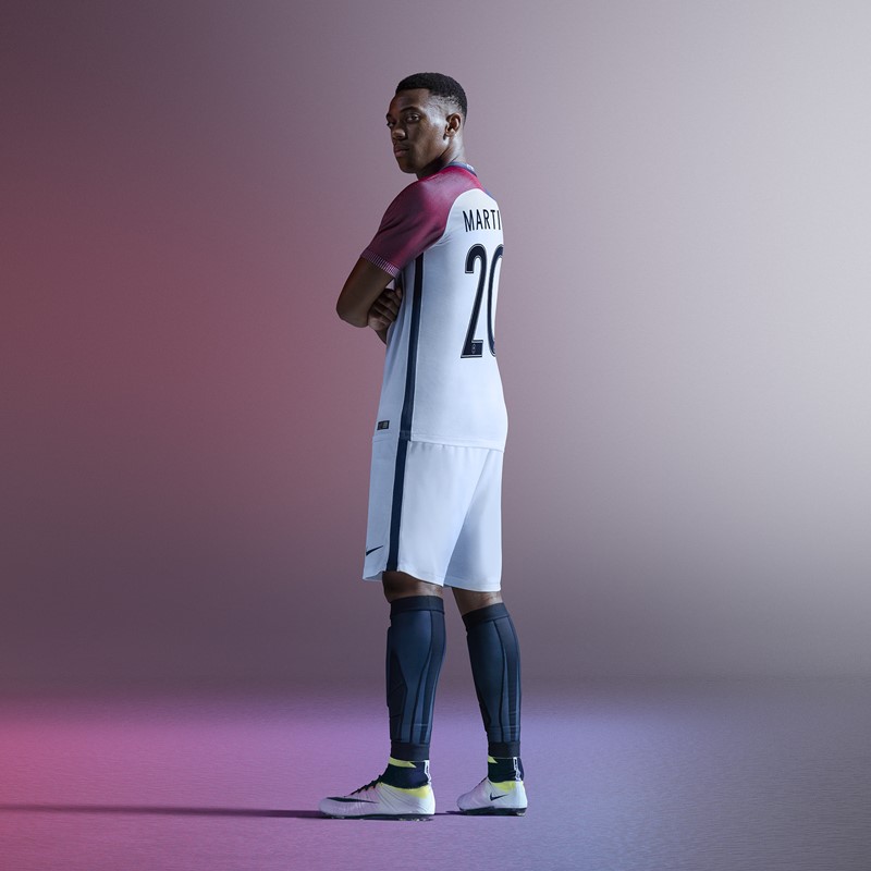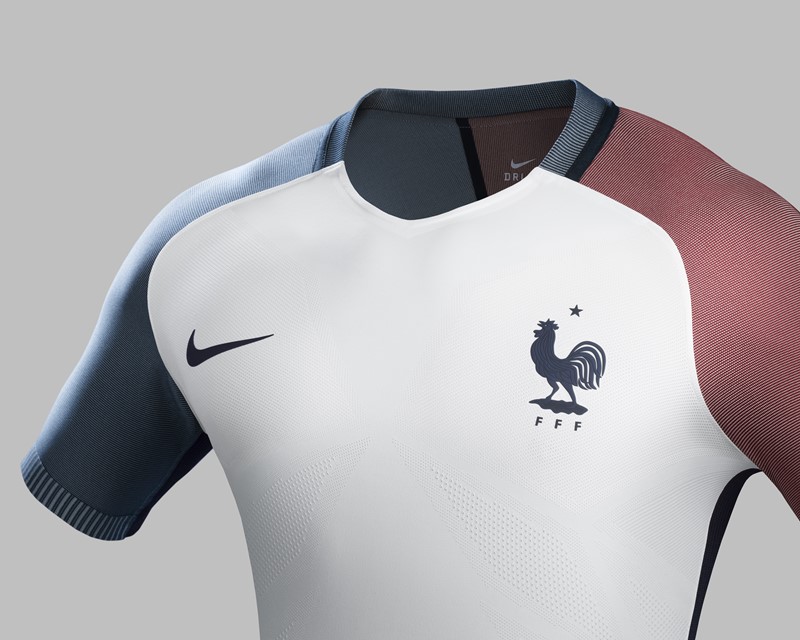 アウェイは白を基調に、フランス国旗のトリコロールのカラーリングを採用。ただ、青と赤には暗めの色を使用している。