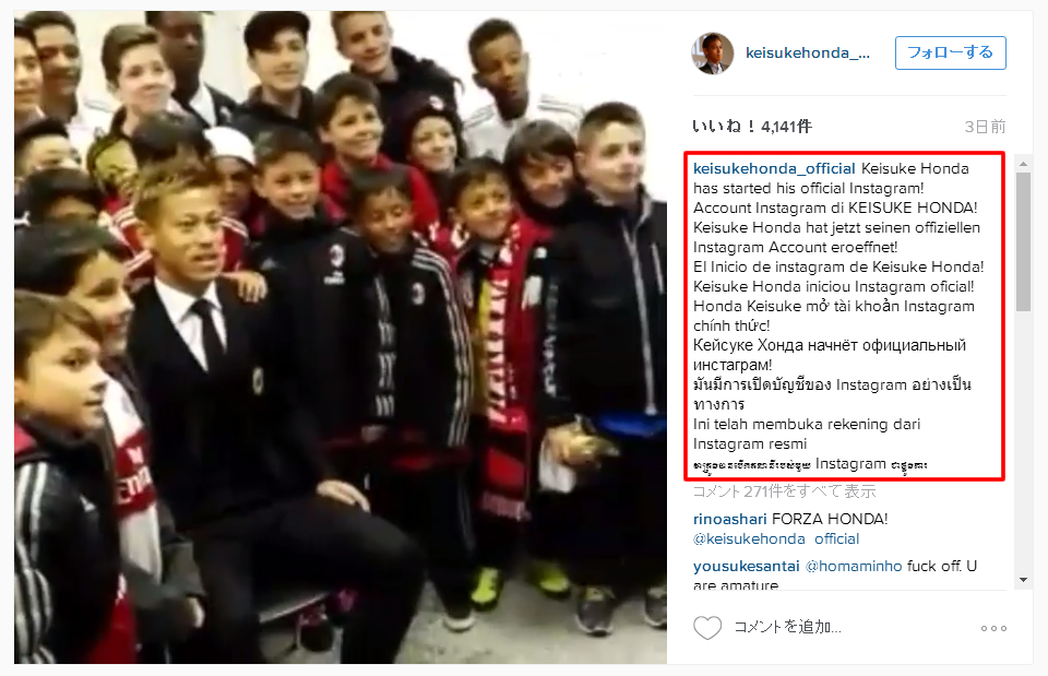 川島、吉田麻也、長谷部誠、そして本田と共に写っている。そしてキャプションには「@keisukehonda_official」の文字。そう、本田圭佑のオフィシャルアカウントだ。