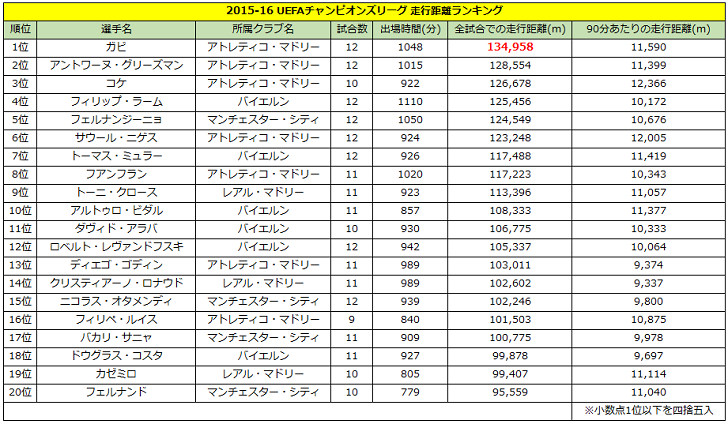 全選手の中で最も長い走行距離を記録しているのはアトレティコのキャプテンを務めるガビだ。130kmを超えているのは全選手の中でガビだけである。FWのグリーズマンが2位というのも、アトレティコの戦い方が反映されている。