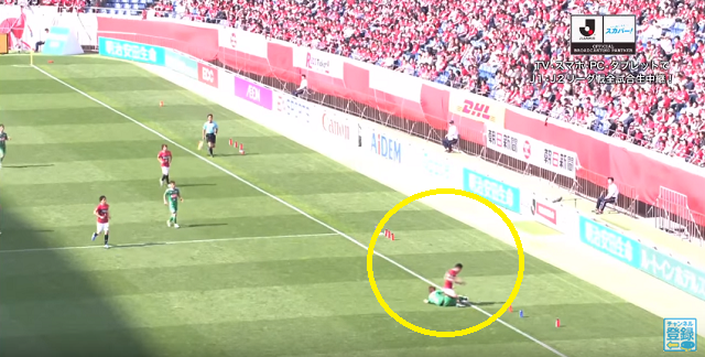 しかし、ここにFW山崎亮平が追走していくとタッチライン際でスライディングをしボールを奪取!ここから一人でカウンターアタックを仕掛け、最終的には遠藤航もかわしシュートまで持ち運んだのだった。