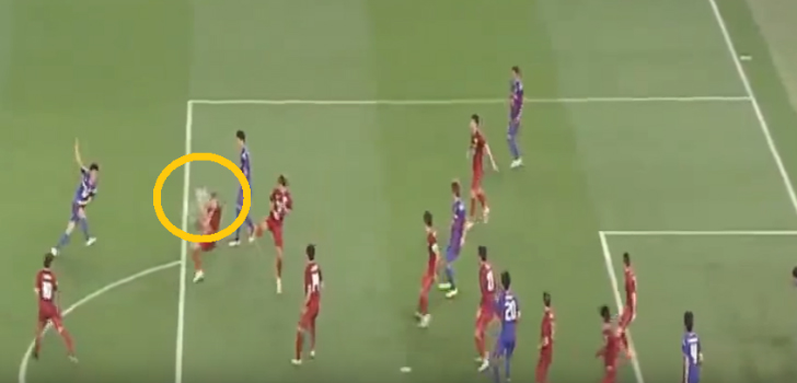 橋本拳人のシュートを、上港の選手が体を投げ出してブロック。その際に上港の選手が手で防いだとして、主審はFC東京にフリーキックを与えた。