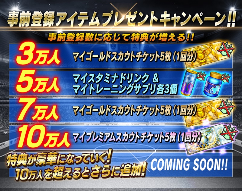 また、事前登録者数に応じて豪華特典を全ユーザーにプレゼントする「事前登録全員プレゼントキャンペーン」を開始しました。目標の事前登録者数を達成する毎に、ゲーム内ガチャ「スカウト」を回すことができる「マイプレミアムスカウトチケット」など豪華アイテムが特典に追加され、本作の正式リリース時に全ユーザーの皆様にプレゼントします。
