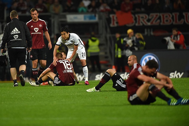 ピッチに座り込み途方に暮れるニュルンベルクの選手たちに声をかけて回っていたのだ。