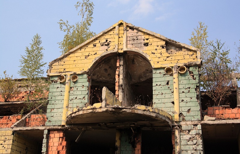 戦争の爪痕が残るサラエボの建物。銃弾の跡がわかるだろうか?