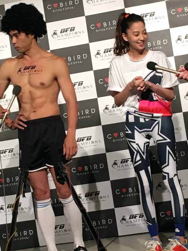 プレゼンテーションに続いて登場したのはタレントの河北麻友子さんと小島よしおさん。さっそく『BFB Champions』を体験し、二人による対戦では河北さんチームが見事なゴールでガッツポーズを見せた。