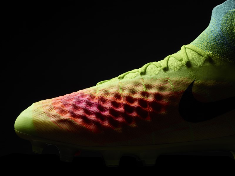 Nikeフライニットテクノロジーを用いたデザインはスパイクの印象を変え、ピッチ上で感じる印象やタッチを一新。繊細な動きに対しても足をしっかりサポートし、脳とボールの間にある“距離”をさらに近くした。