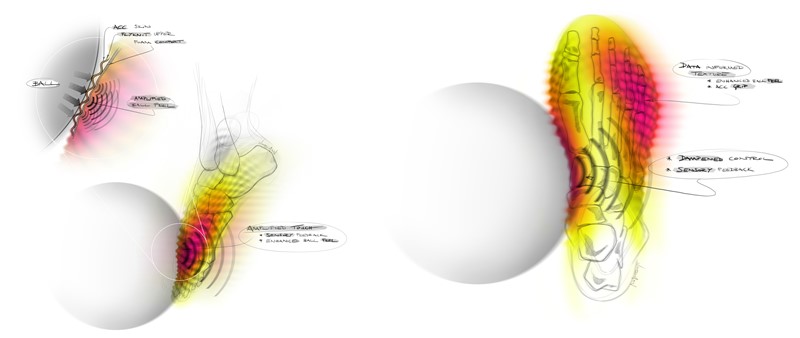「進化や形態学についての研究を読んでいるうちに、手や指のしわ、指紋は、濡れた表面や道具をしっかりとつかむために進化した結果だという仮説に興味を持つようになりました。もし足の最優先の使用目的がフットボールであったのなら、進化の過程でどのような適応が起こるのだろうかと考えるようになったのです。」と、Nikeのデザイナー、フィル・ウッドマン氏は語る。