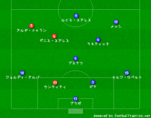 マスケラーノとイニエスタの位置に新加入のウンティティとデニス・スアレスが入り、ネイマールの左ウィングにはアルダが入った。