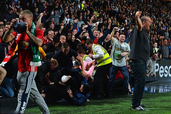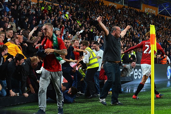 ハルのホームゲームではあったものの、ゴール後にはコーナーフラッグ付近でユナイテッド選手たちが喜びを爆発。そこにファンもなだれ込み、まさにカオスな状態となった。