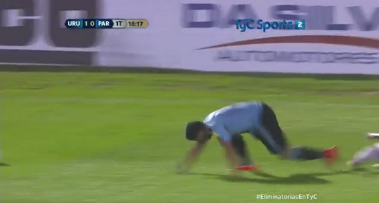 一度はスライディングに行った足が体に入りピッチに倒れるのだが、次の瞬間、手を使って体勢を整える。そして何事もなかったかのように立ち上がり、なかで待っていたエディソン・カバーニへと絶妙なアシストを送った。