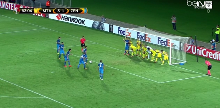 これを防ぎたいマッカビ・テル・アヴィヴは、もちろん10人全員がゴールマウスの中へ(1人は直前に退場)。一方のゼニトはボールの近くに6人が集結するなどまさに“ガチンコ”の様相を呈していたのだが、結果は…