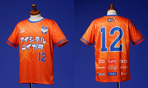 新潟は今年が20周年。これに合わせて今回、「アルビレオ新潟」設立当時にチームが着用していたデザインをベースに、クラブ創設20周年記念復刻版ユニフォームを作成。胸に入った定番チャント『アイシテルニイガタ』の文字が印象的だ。