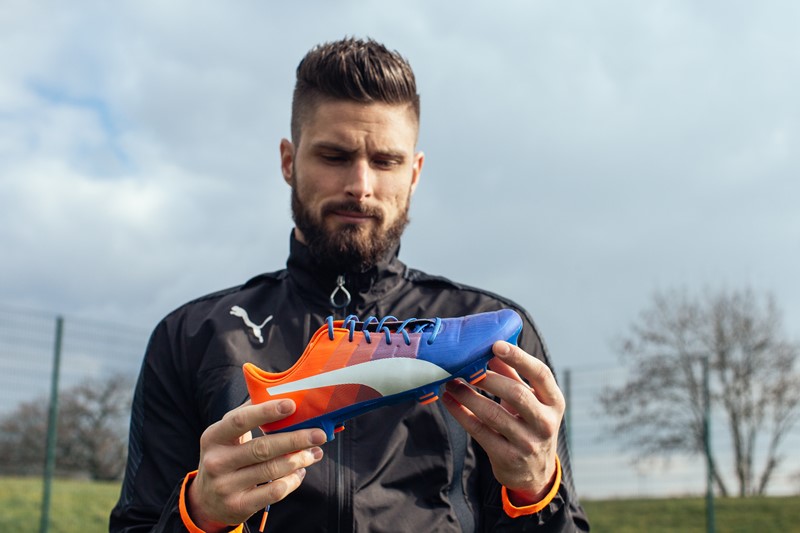 EURO2016でグリーズマンと抜群のコンビネーションを見せたアーセナルのフランス代表FWオリヴィエ・ジルー。彼は今回の新色について、「このエヴォパワーのニューカラーはとてもすばらしいです。ブルーからオレンジにグラデーションしている部分がパワフルで、スパイクのテクノロジーともイメージが合っています」と語った。