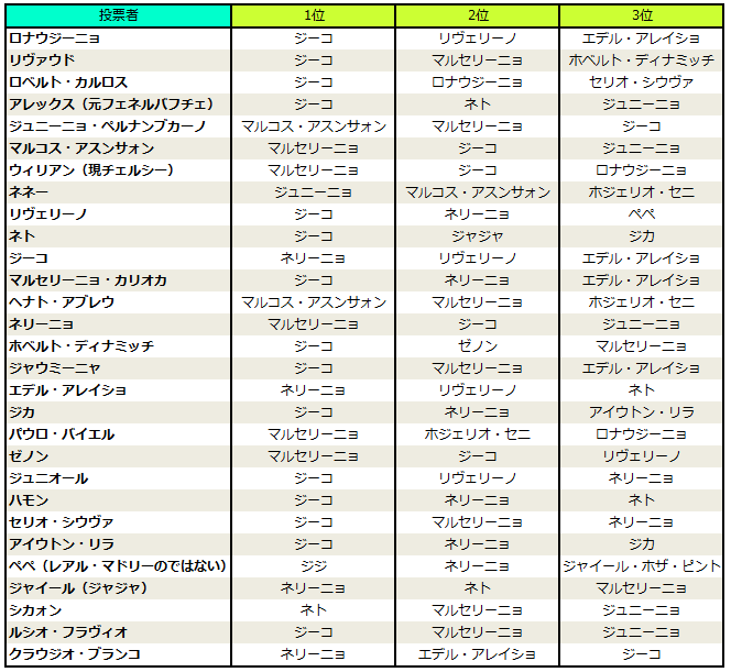 現役世代とレジェンド世代で傾向に違いがあるが、なんといってもジーコが圧倒的!なお、ホジェリオ・セニとネイマールからは回答が得られなかったとのこと。