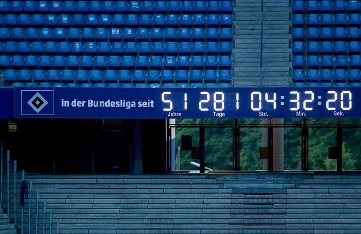 ブンデスリーガ発足後、唯一2部降格の経験がないハンブルガーSV。これはバイエルンでも成し遂げていない偉業(バイエルンは創設メンバーではなかった)であり、アイエムテック・アレーナには1部でプレーし続けてきたことを示すデジタル時計が表示されている。