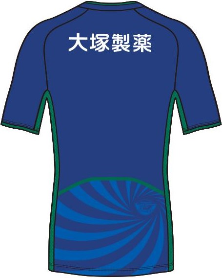 全体の青が吉野川、後ろ襟の緑が眉山、シャツ両脇からパンツ・ソックスにかけての緑は吉野川に映る眉山を表し、胸元の襟の赤でVORTISの頭文字であり、力強く戦い勝利を掴むという意味を込めた“V”を表現している。